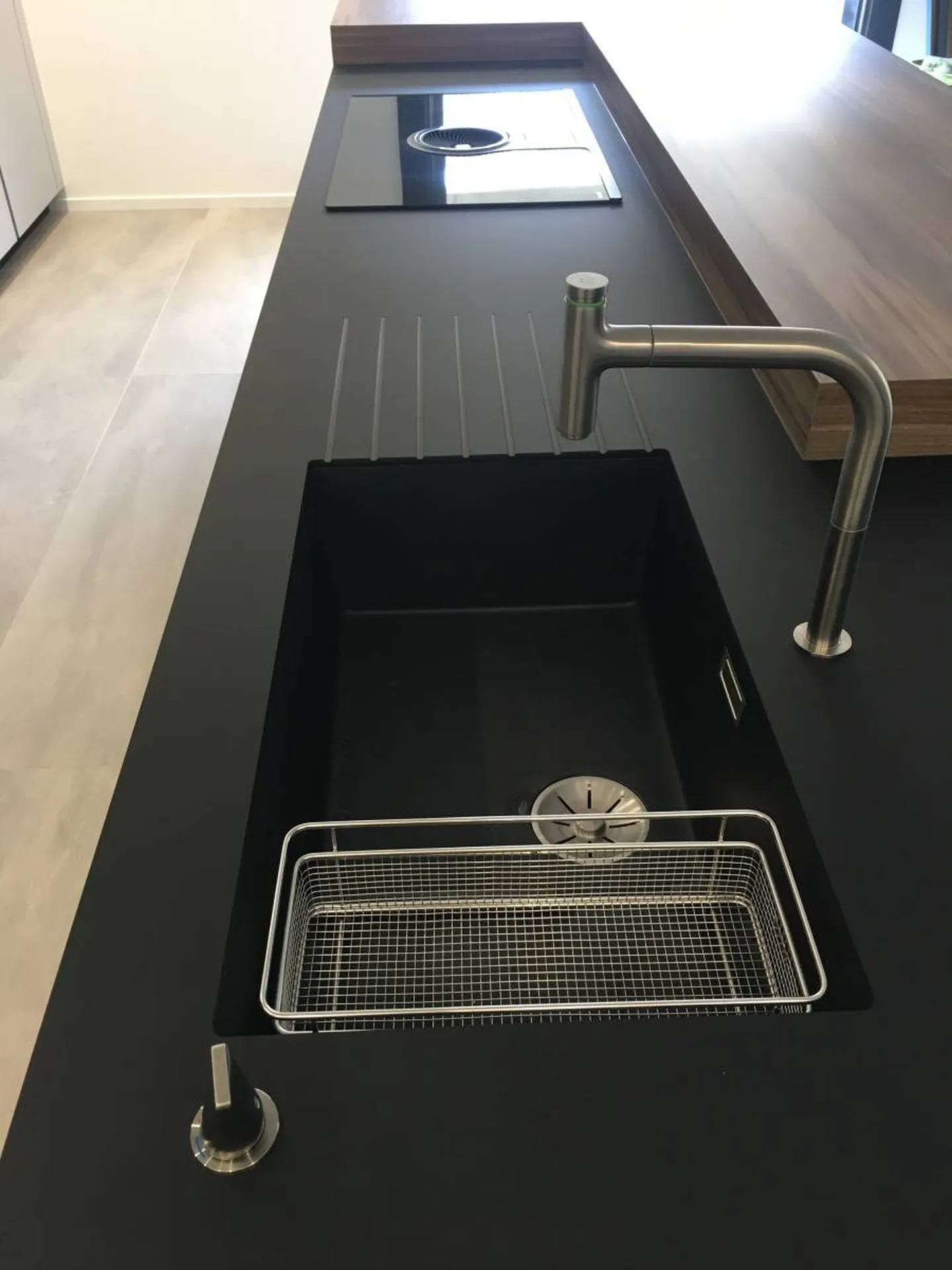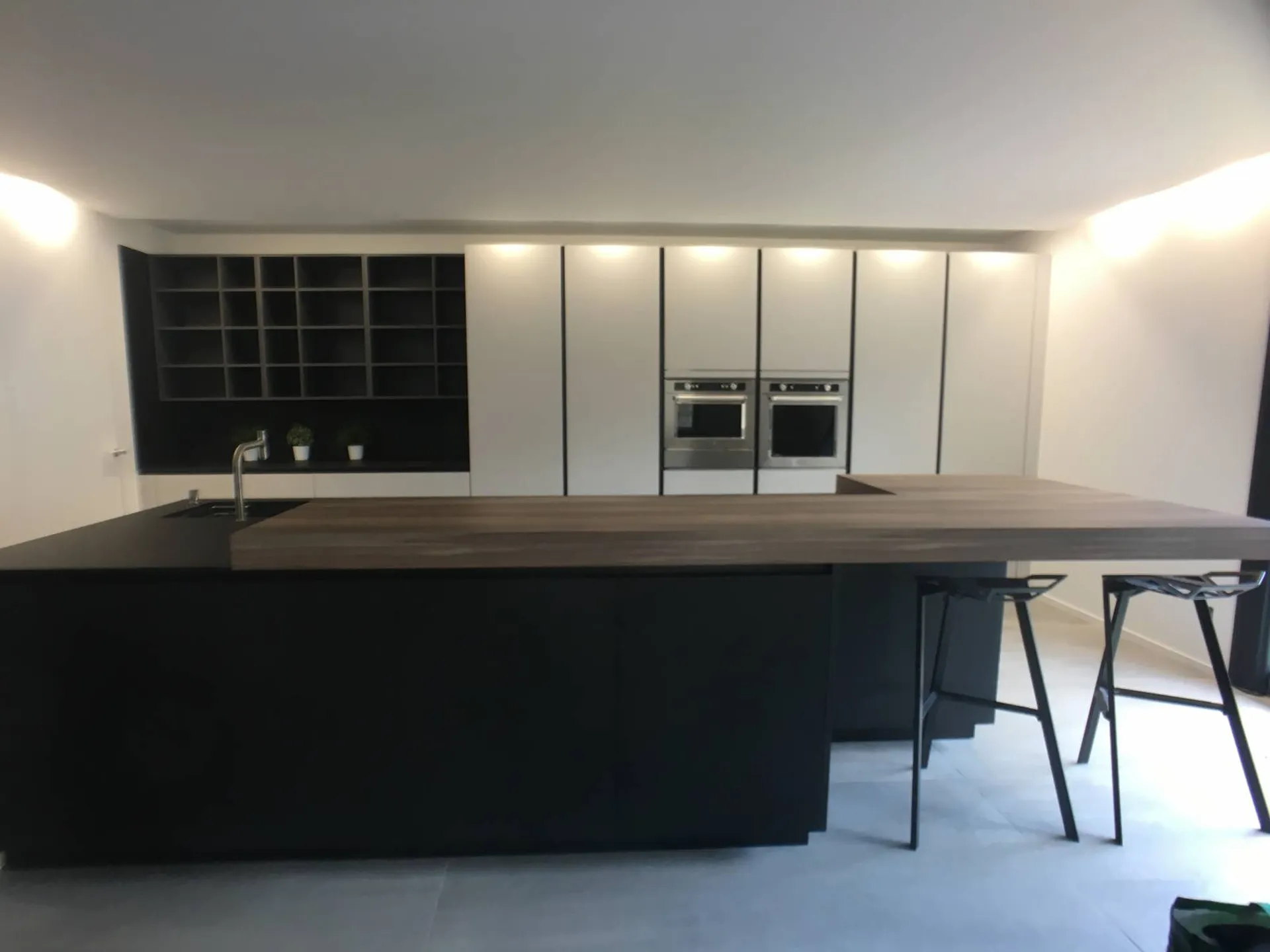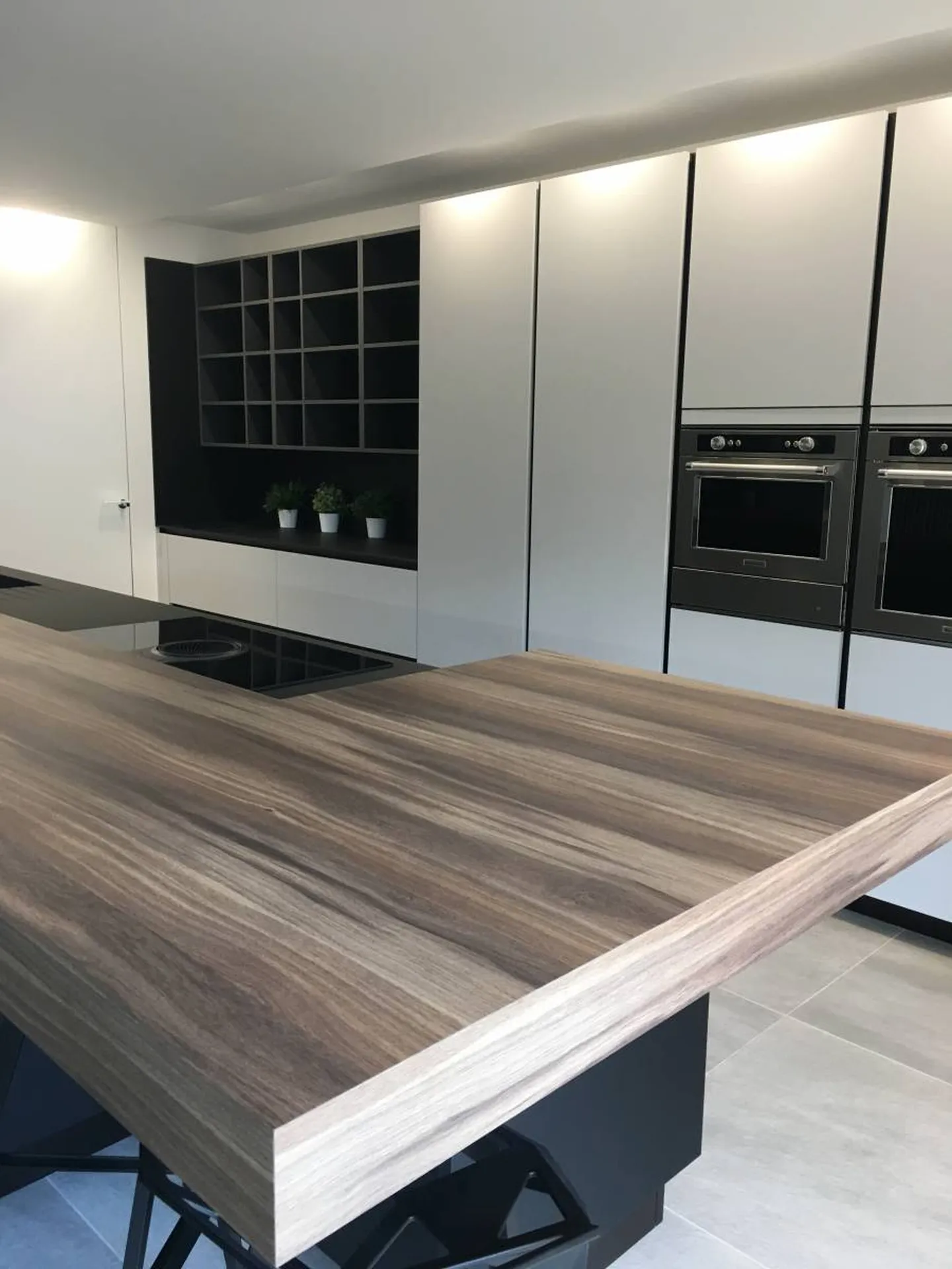 Côté matériaux, nous avons choisi des panneaux ultra mats en Fénix NTM grigio efeso et nero indigo, sublimés par la chaleur du noyer américain. Celui-ci est présent aussi bien sur le plan de l’îlot central que dans la séparation verticale de type claustra, offrant un équilibre parfait entre modernité et authenticité alpine.