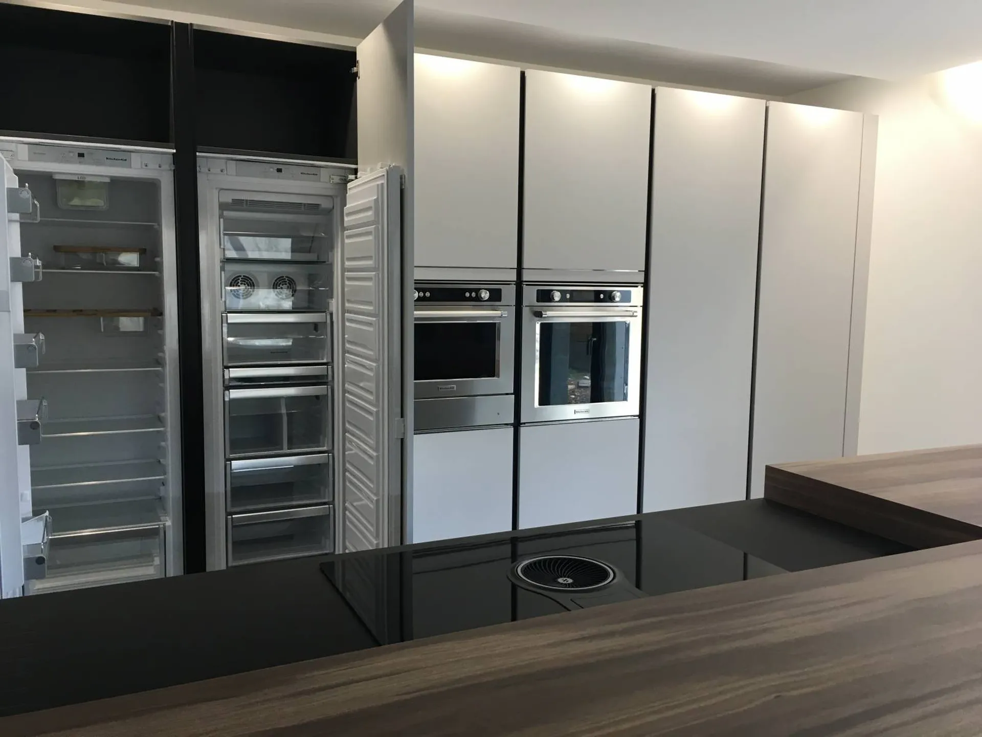 Le linéaire de colonnes intègre un électroménager haut de gamme encastré : réfrigérateur, congélateur, four, micro-ondes et tiroir chauffant, afin de garantir une ergonomie parfaite et un confort d’utilisation au quotidien.