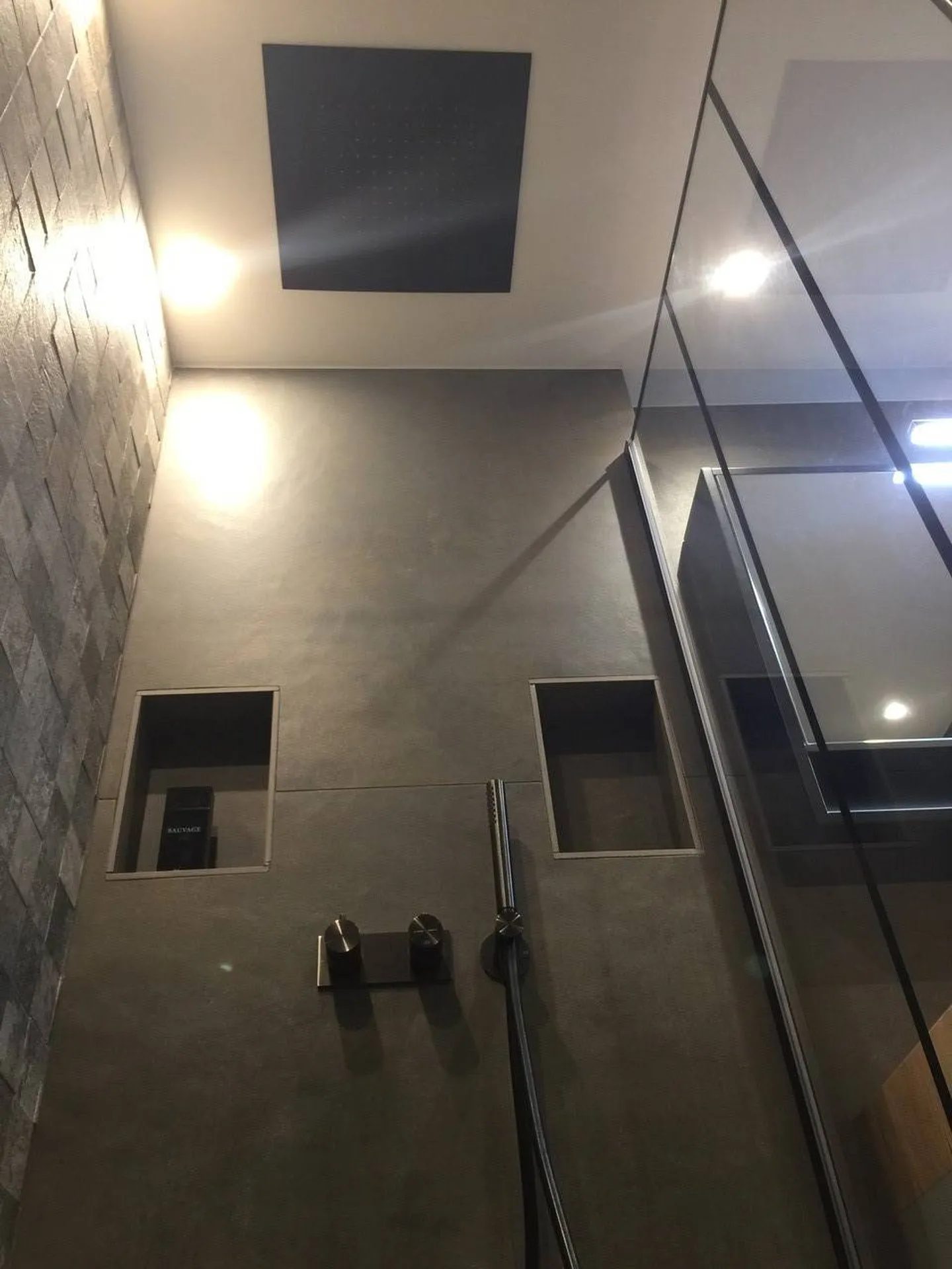 Des matériaux tels que du carrelage grand format 100x100 et du carrelage pierre effet 3D font partie de cette ambiance épurée et minimaliste.