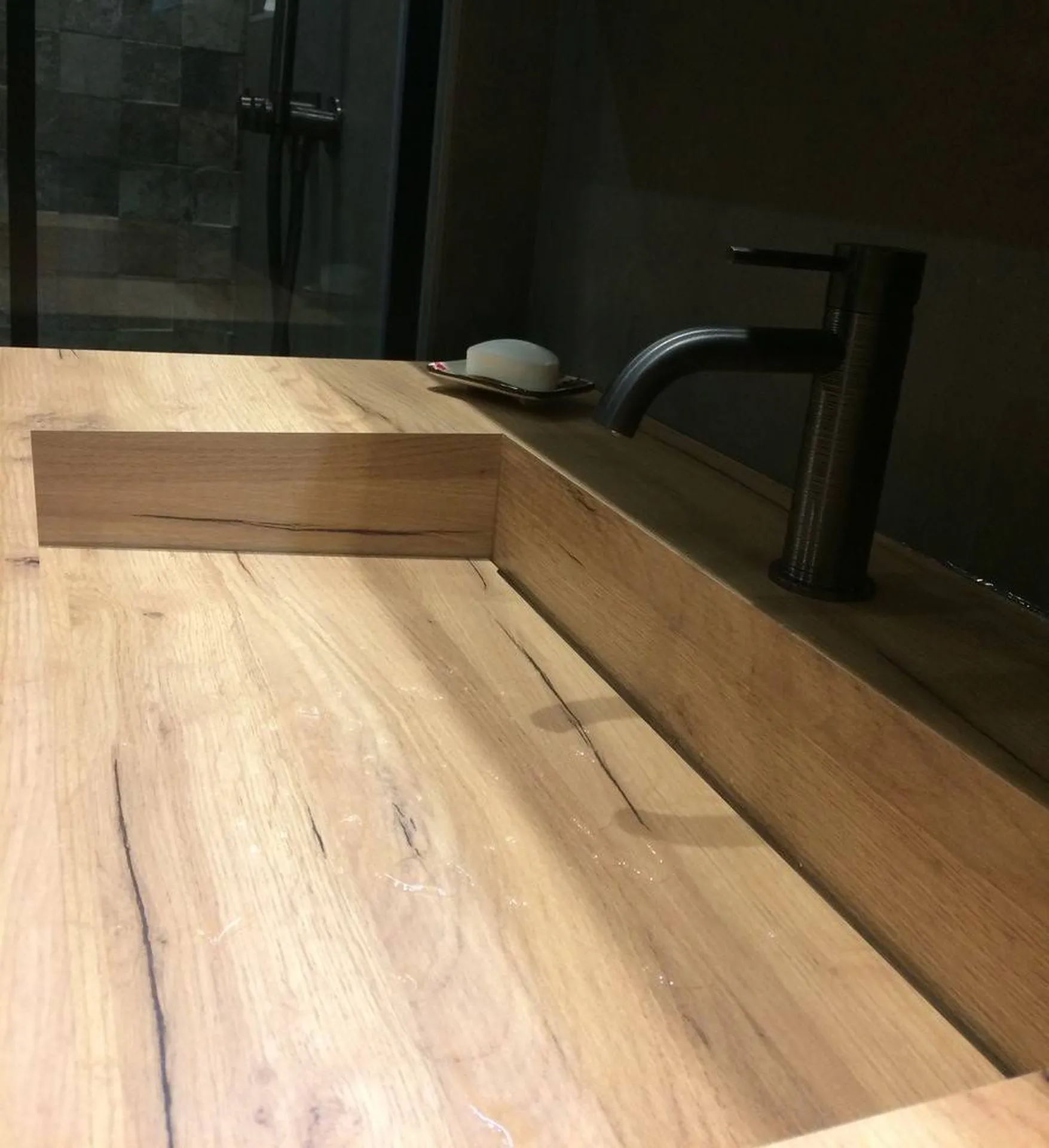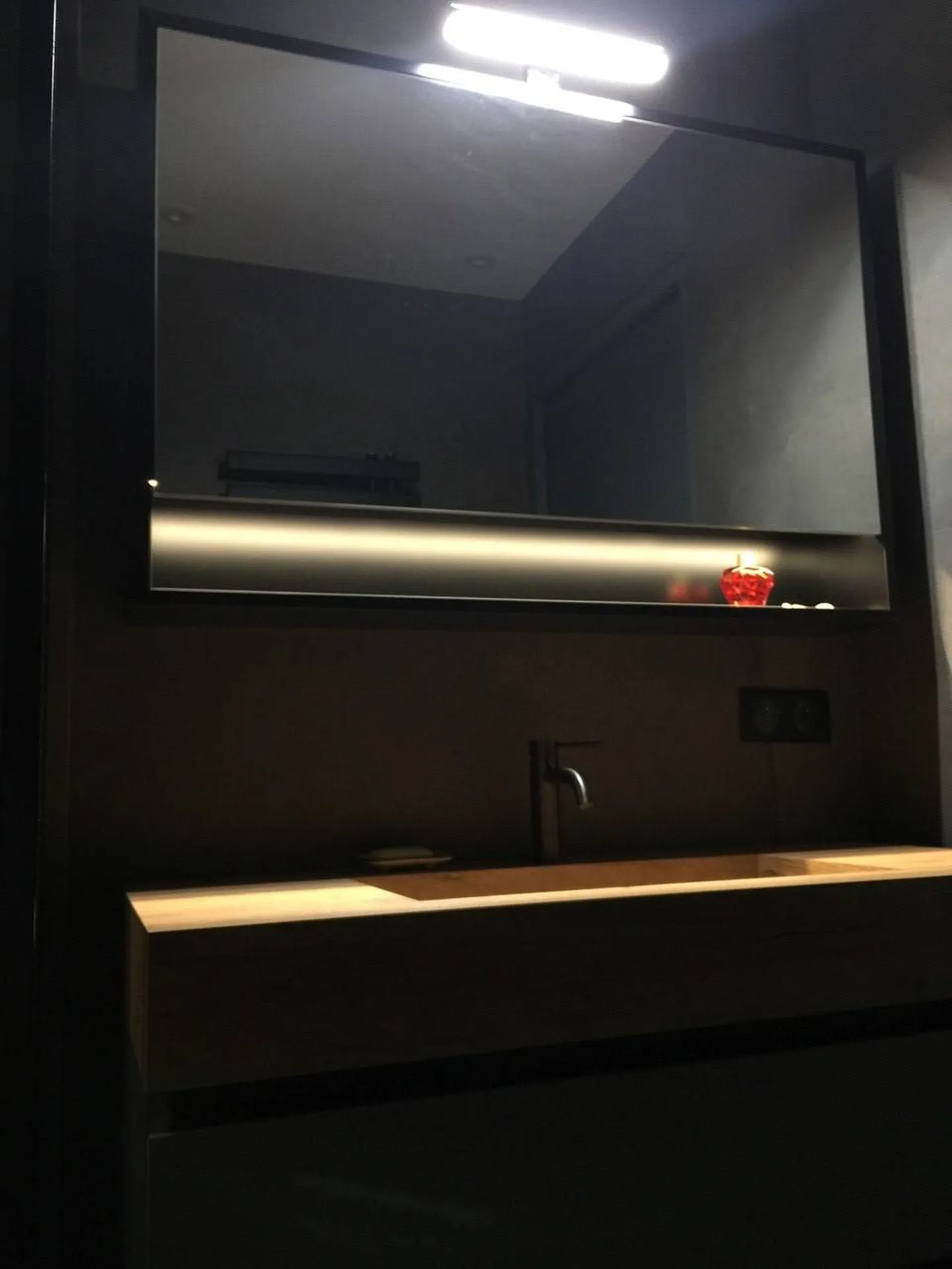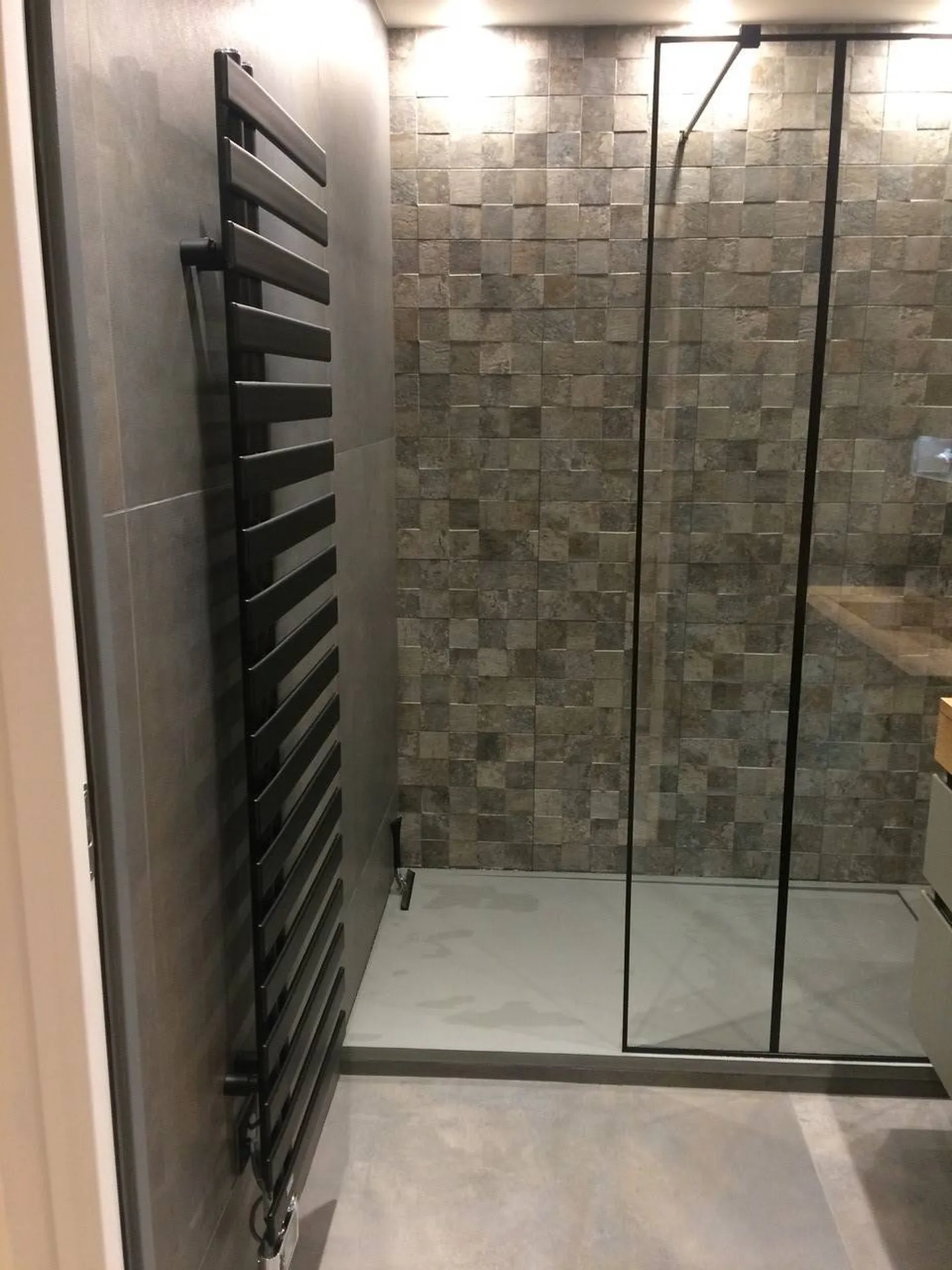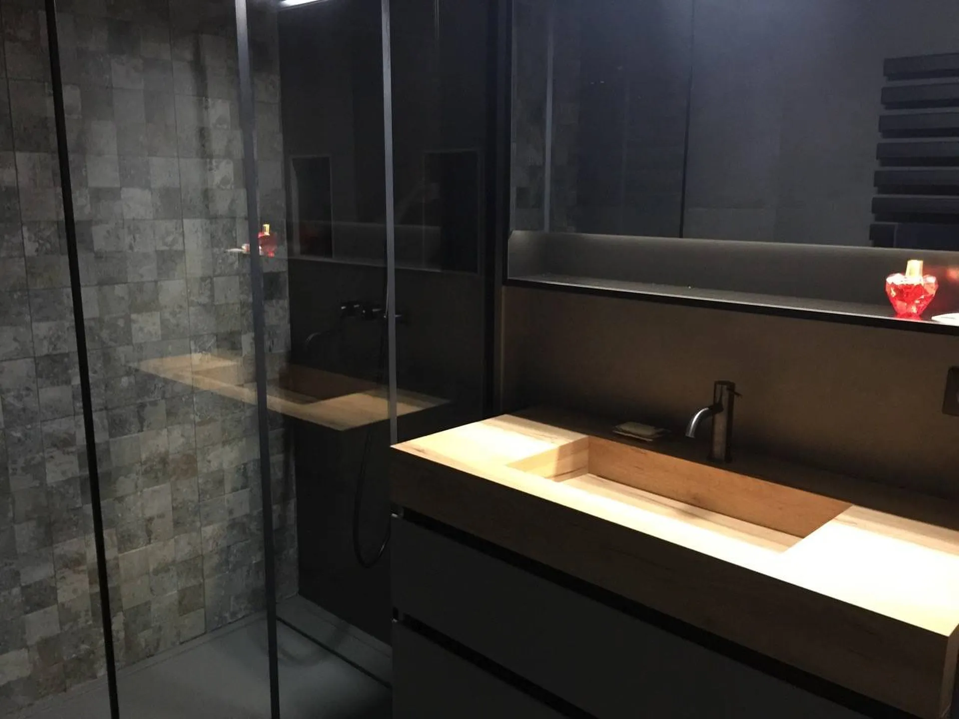 Un plan vasque intégrée en compact effet bois avec écoulement caché marié avec la robinetterie GESSI finition black métal et le ciel de pluie noir mat. La douche sera composée d'un receveur béton et d'une paroi de douche fixe type atelier avec un profilé noir mat assorti à la robinetterie GESSI. Cette touche de noir se trouvera aussi dans l’armoire de toilette avec LED intégrées de même que le sèche-serviette qui est en finition noir opaque.