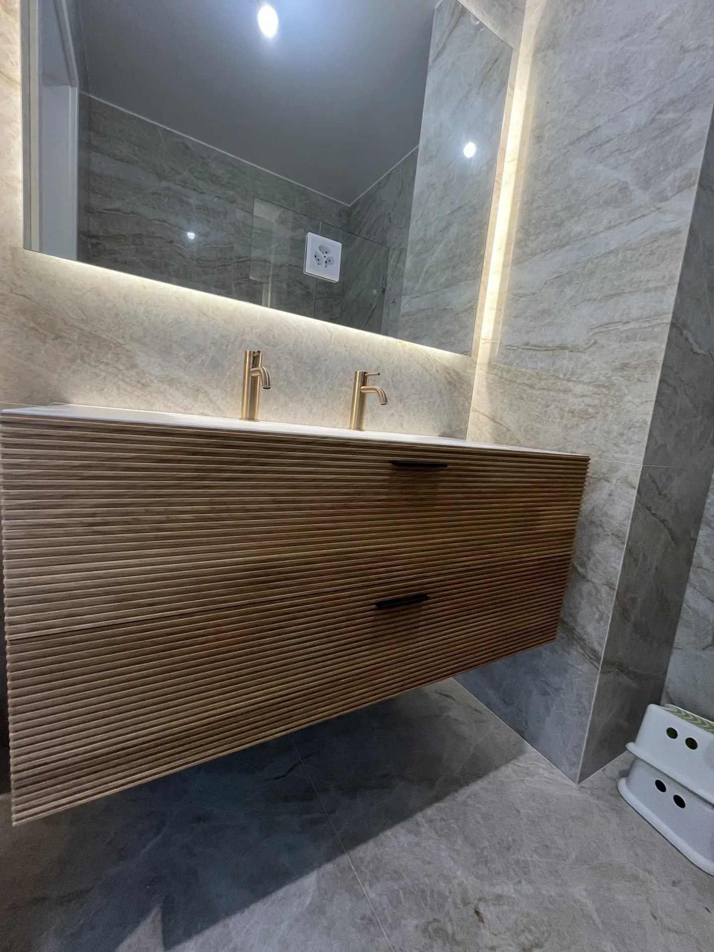 Pour cette étude nos clients ont sélectionné des meubles inbani en finition bois naturel chêne cannelé et une robinetterie inox 316 de la marque luxueuse gessi .