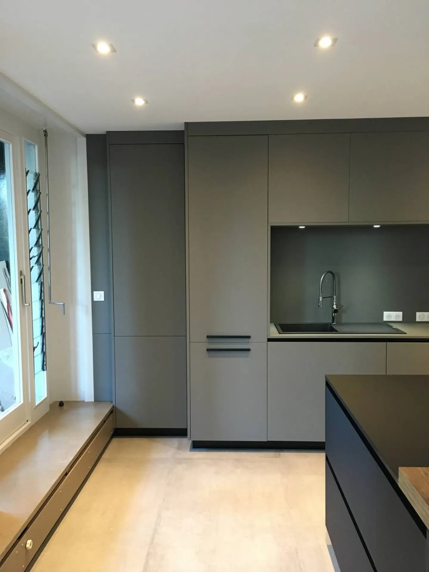 Pour cette cuisine avec ilot à Lyon, nos architectes ont décidé de sélectionner deux Fénix ultra mat couleur "Gris Londres" et "noir ingo". Afin de redonner de la chaleur à cet espace le plan snack a été conçu en Noyer américain, il permet à la famille ou aux invités de venir s'installer et partager un moment convivial en profitant de chacune des personnes présentes.