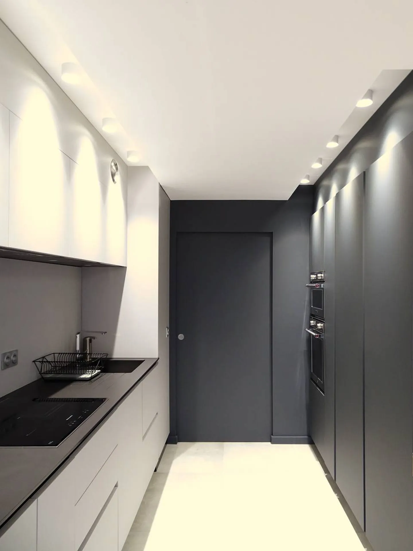 Cette cuisine est le modèle R1 avec des prises de main par gorges creuses verticales et horizontales tout en aluminium laqué noir mat.