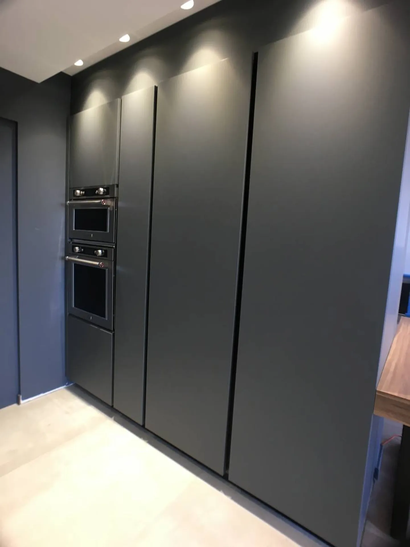 Un mur de colonnes cache une grand partie de l'électroménager tels que le four, le micro-onde, le réfrigérateur, le congélateur, et divers rangements. Ces colonnes sont en finition fenix NTM grigio bromo extra mat.