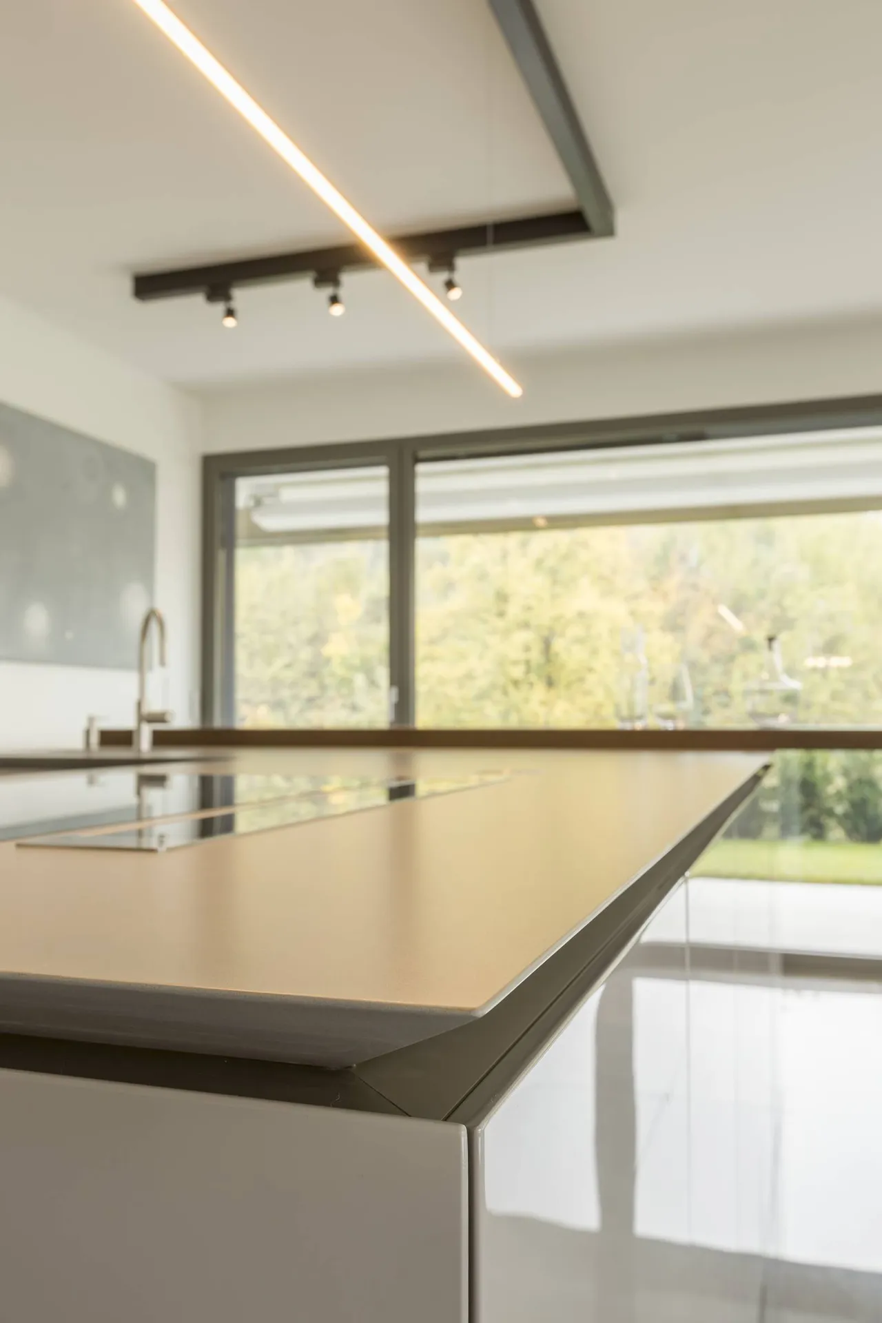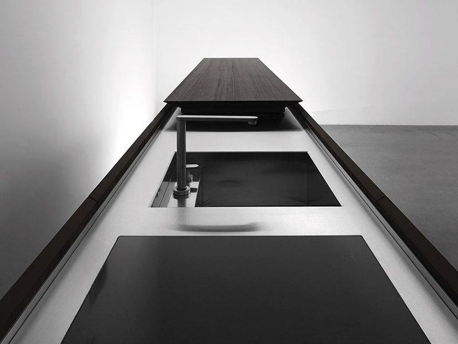La collection M5 est une confection exclusive de Minimal Cucine où le plan de travail biseauté à 60 degrés semble être en lévitation sur des façades biseautés à 35 degrés. Cette faille est comblée par une lame d'aluminium brut ou bien laqué dans la couleur de votre choix se mariant avec les façades ou le plan par exemple.