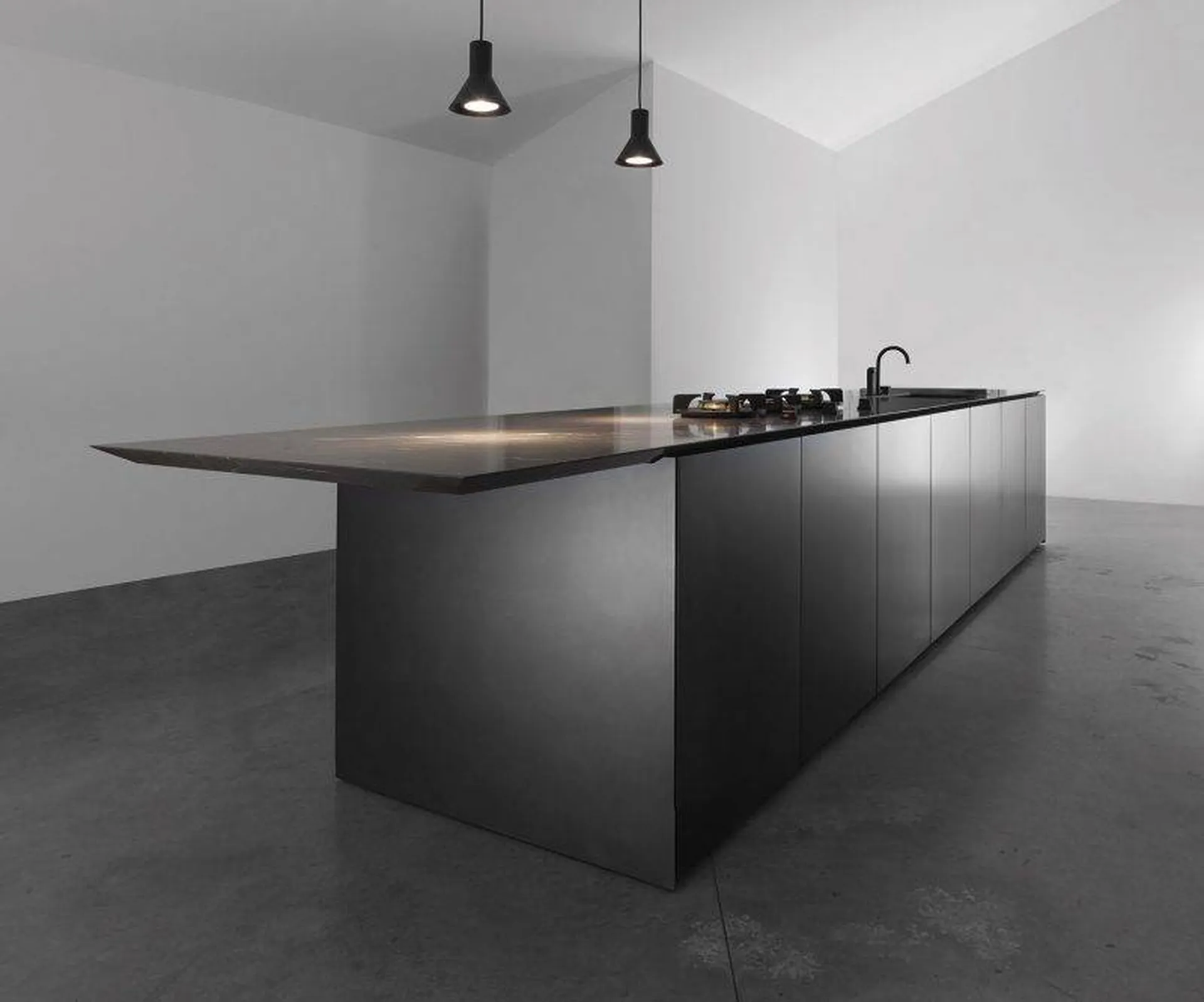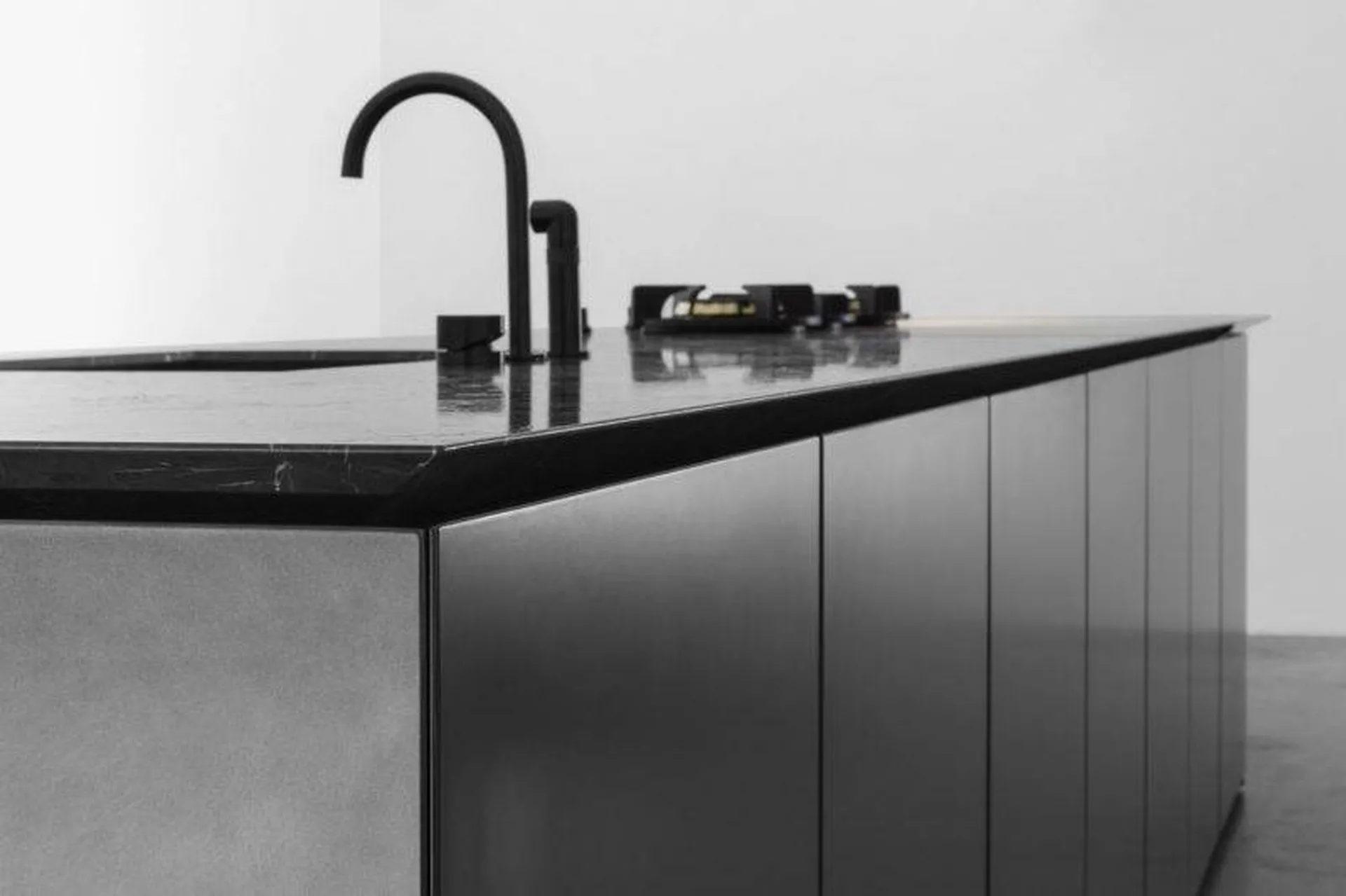 Les finitions disponibles pour cette collection sont pour les façades : en métal laqué, en titane ou bien en acier noir, en pierre naturelle, en laque mate extra soft, métal laqué, ou encore en bois massif.
