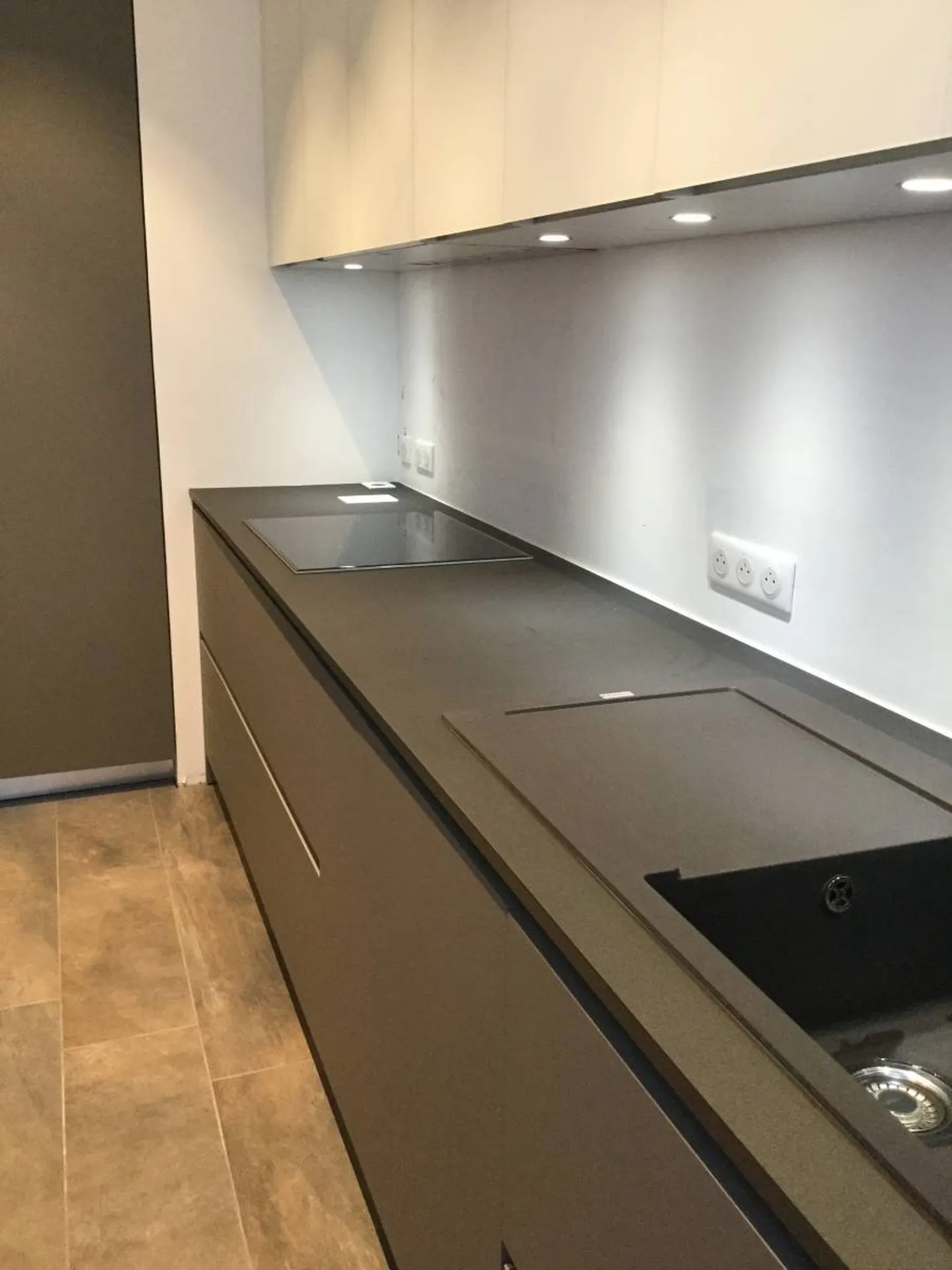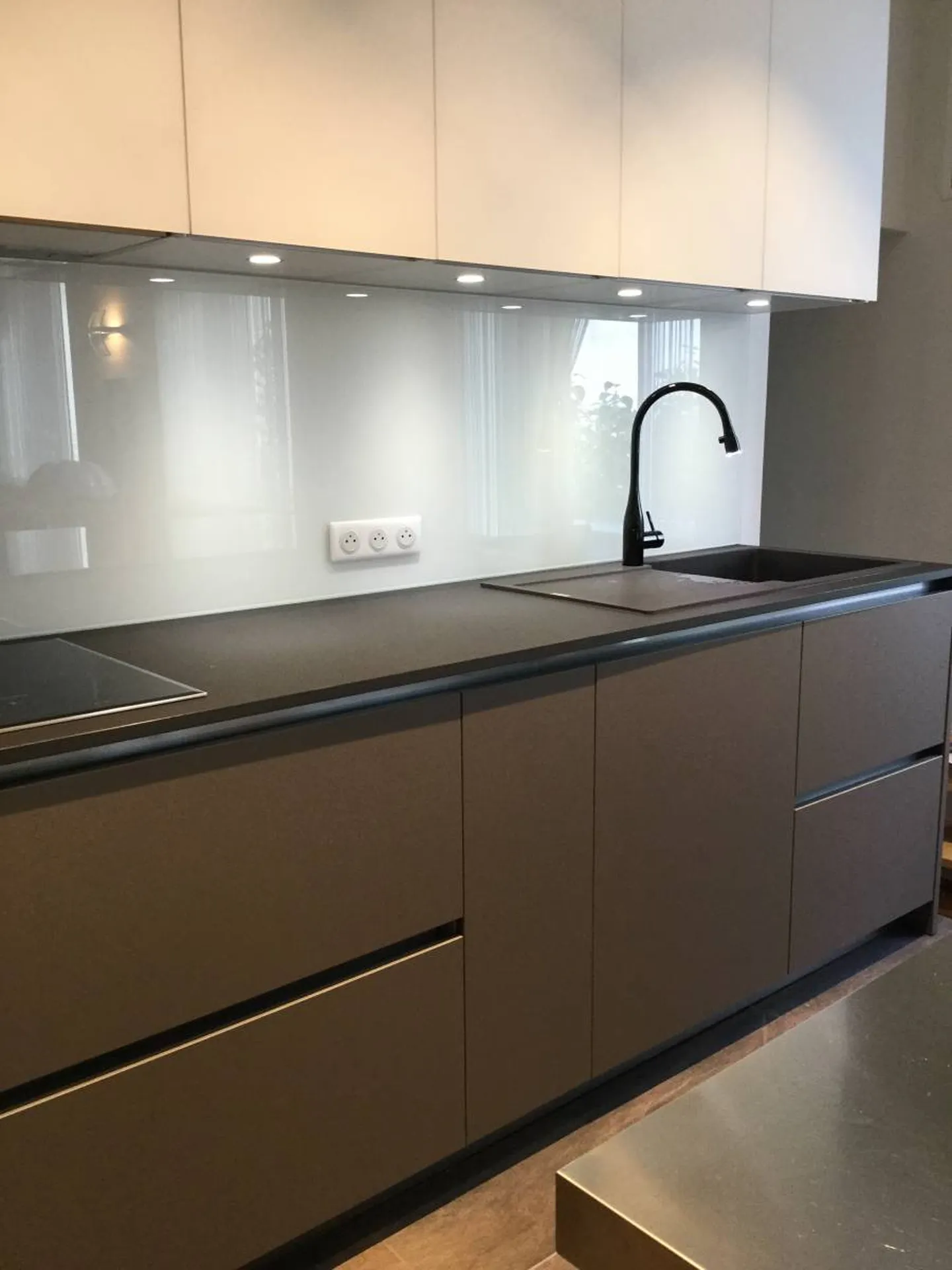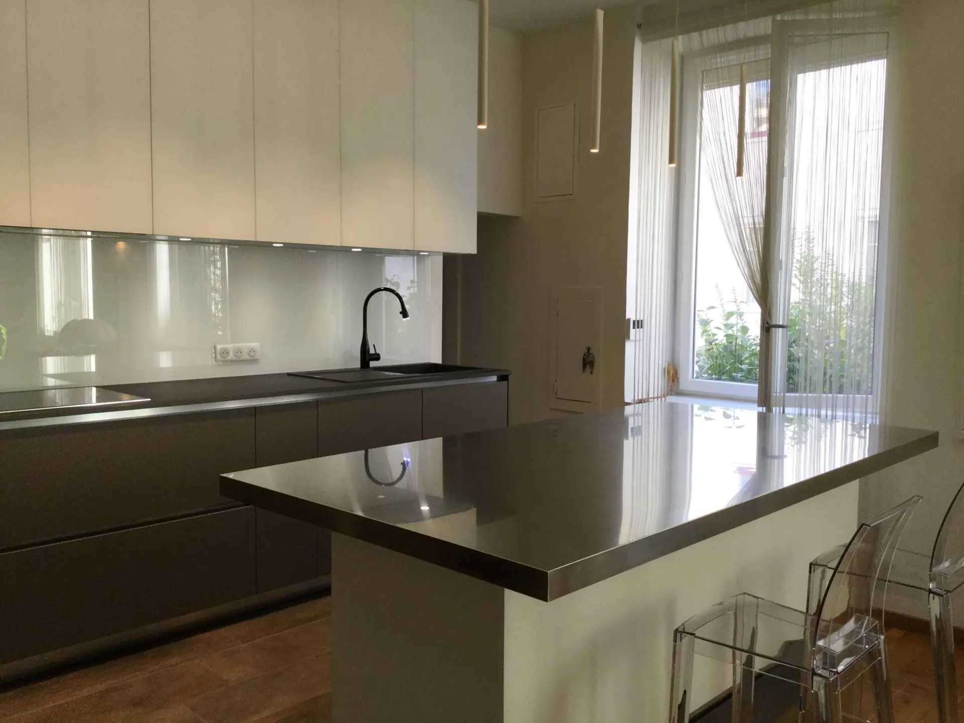 Un délicat mélange entre le verre dépoli et le Fénix gris Londres, l'ilot quant à lui reprend l'esprit de ce loft avec son inox satiné.