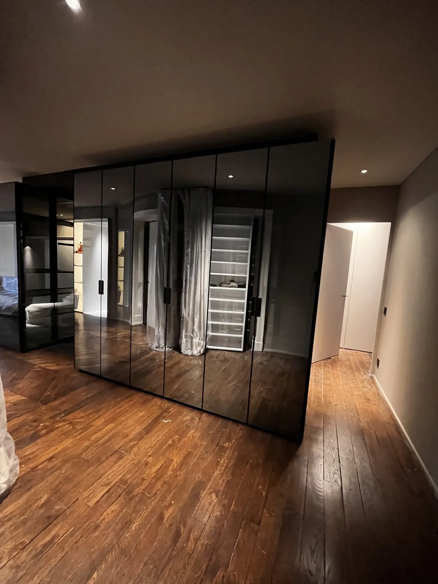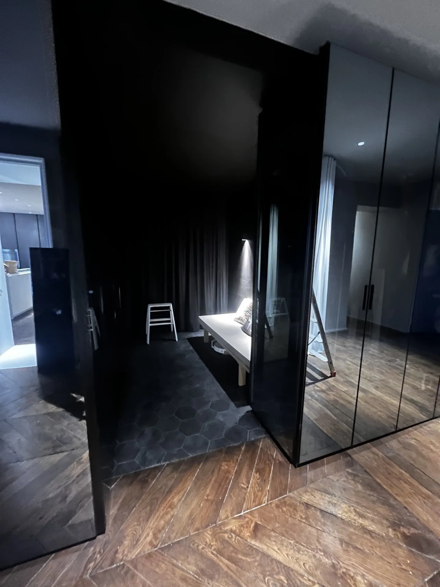 L'architecte de renom Sébastien Belle a imaginé pour son dossier A ce concept de cube réfléchissant trônant à l'entrée de l'appartement. Il a naturellement opté pour la marque RIMADESIO, et notamment ses dressings haut de gamme avec porte en verre réfléchissant.