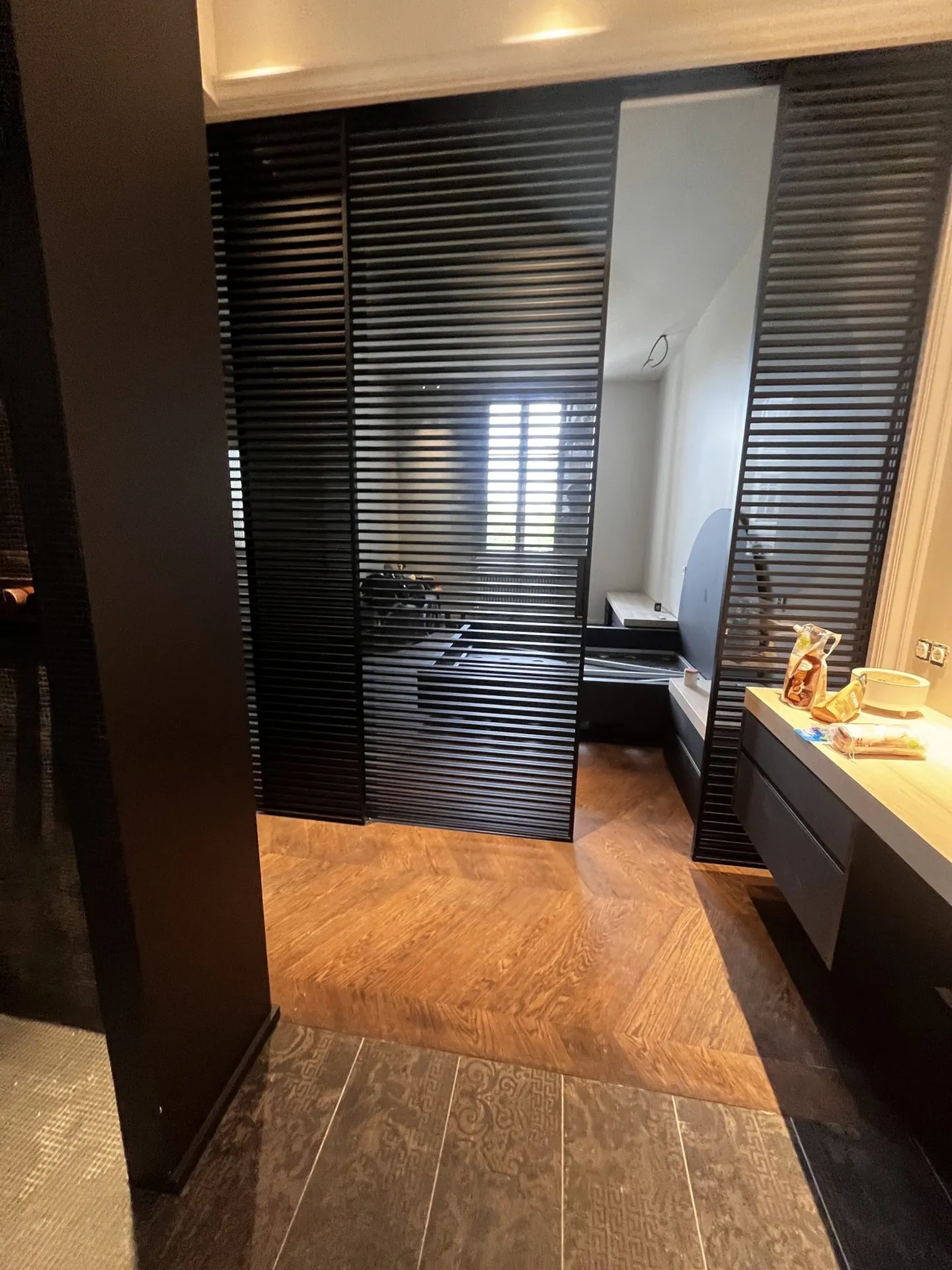 Pour cette rénovation haut de gamme nos clients ont opté pour les portes Rimadesio modèle Sail avec rail encastré dans le plafond .