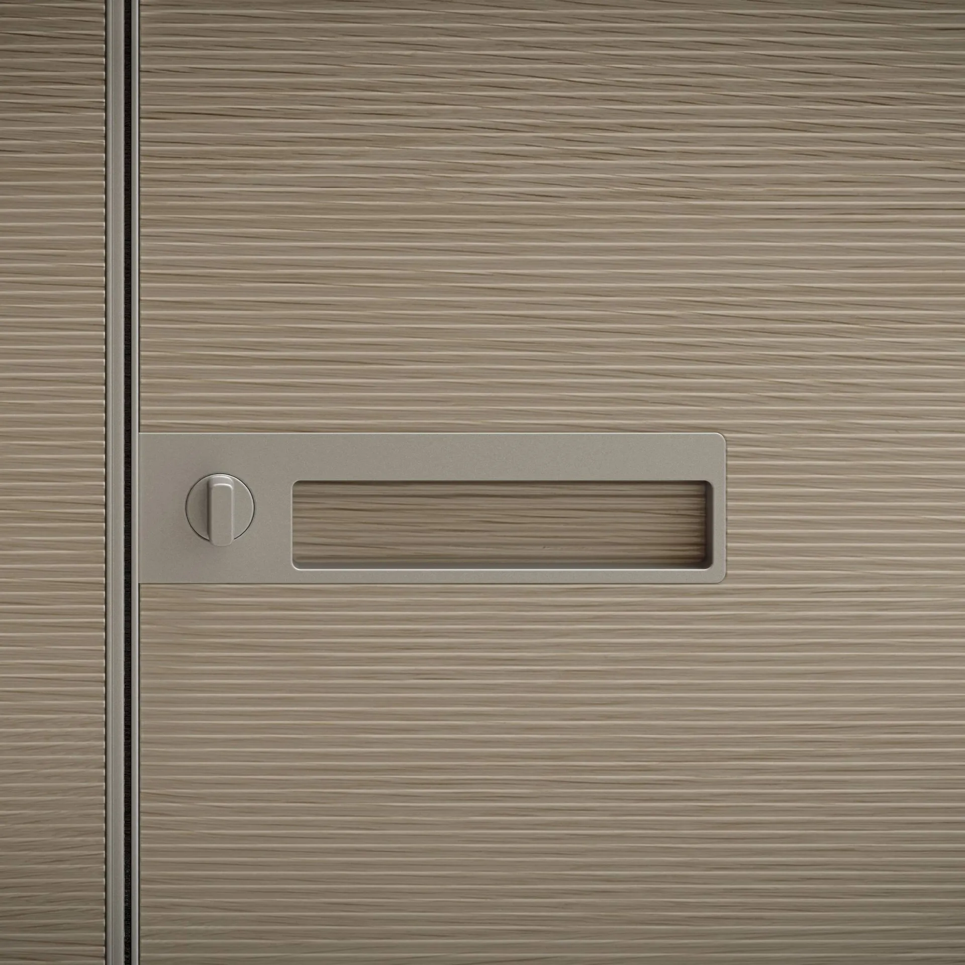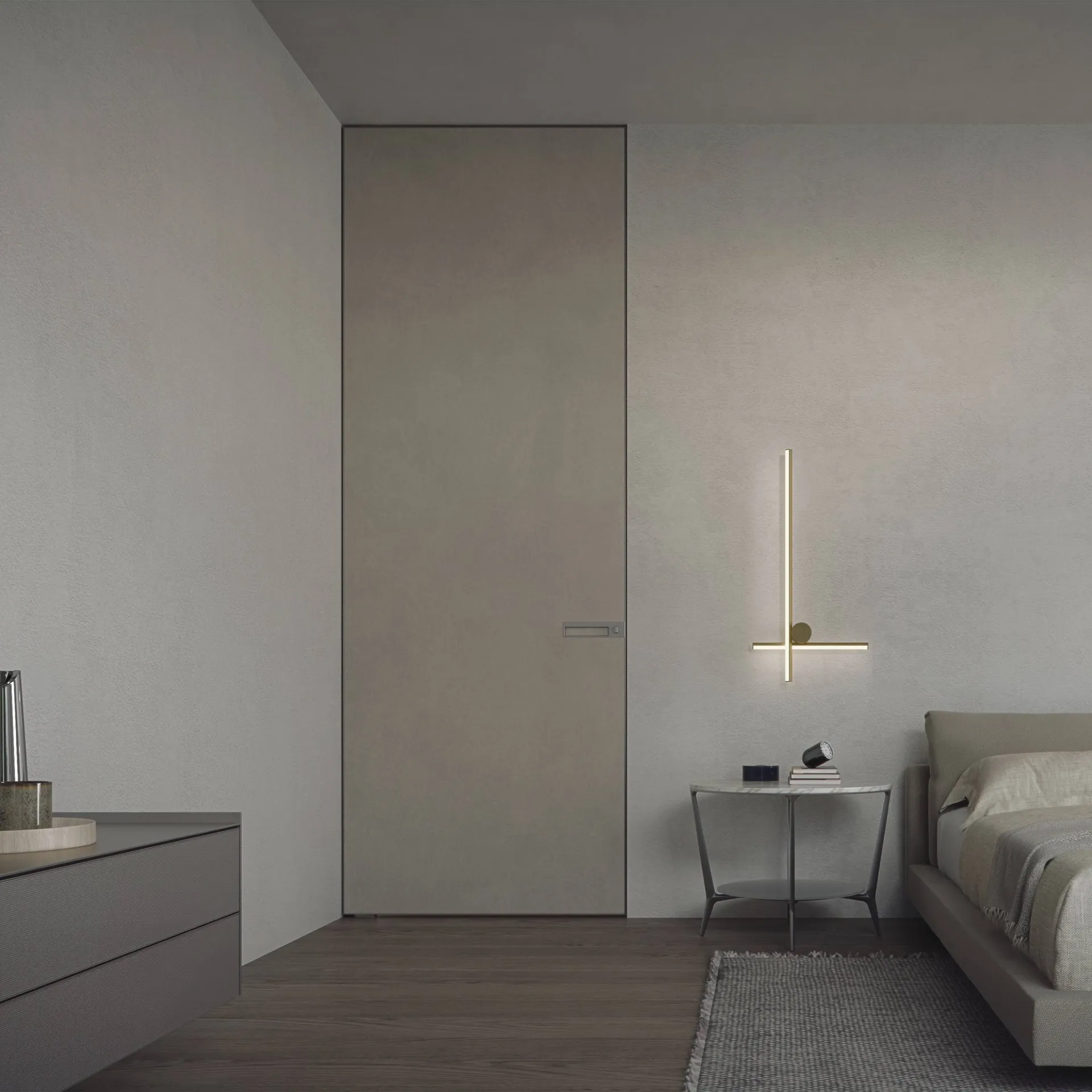 Une solution pleine hauteur parfaitement double face et coplanaire au mur, un design minimal conçu pour recréer une continuité parfaite auprès de l’architecture environnante, un fil du mur fluide et sans contraintes techniques, simplement l'emprise du pivot fixé au sol et au plafond.