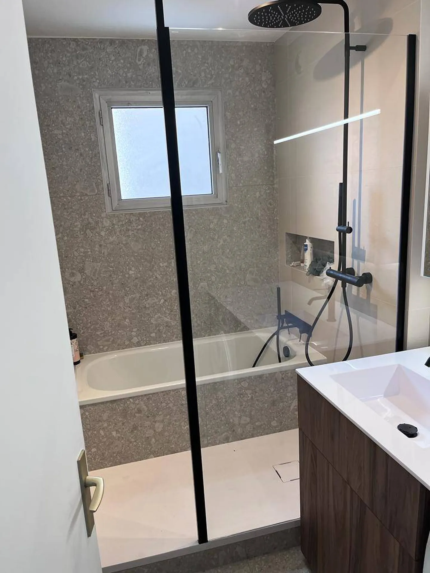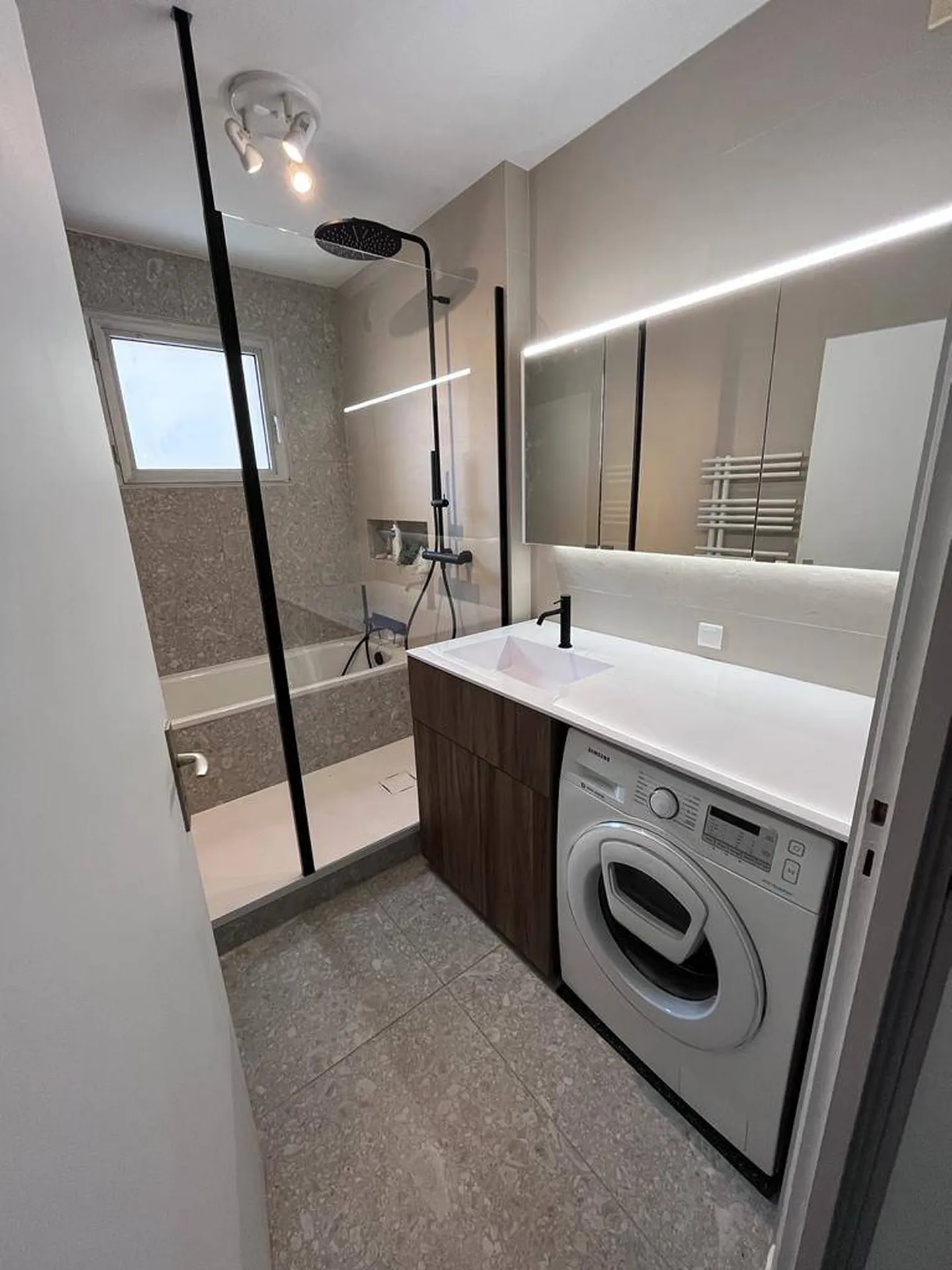 Dans ce petit espace, nos clients souhaitaient avoir : une belle douche à l'italienne, une baignoire à encastrer et un meuble vasque confortable pouvant intégrer un lave-linge en pose libre, ainsi que du carrelage gres ceram effet terrazzo. Notre équipe d’architectes à pu répondre à ce cahier des charges des clients tout en restant dans un style très chic et épuré.