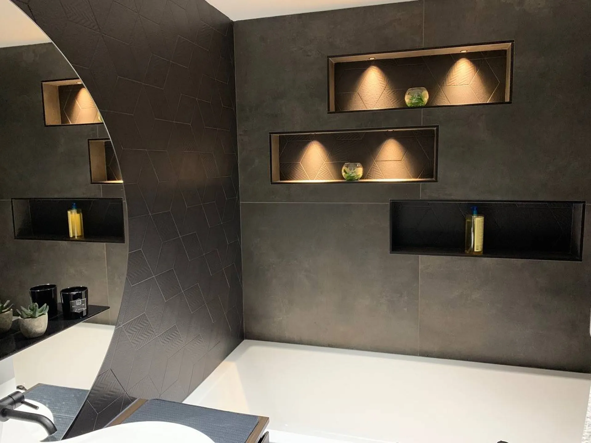 Le décor Rhombus noir qui se trouve sur les murs et dans les niches, géométrique et sophistiqué, permet d'obtenir l'ambiance souhaitée par le client. Nous avons créé un jeu de lumière de même qu'un jeu de pleins et de vides en ajoutant des niches de part et d'autre dans la salle de bain, esthétiques tout en restant pratiques.