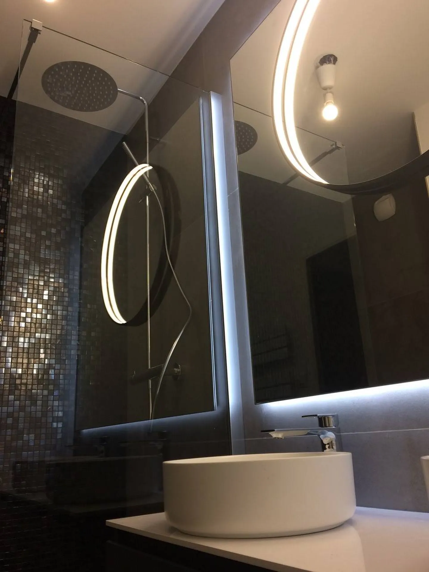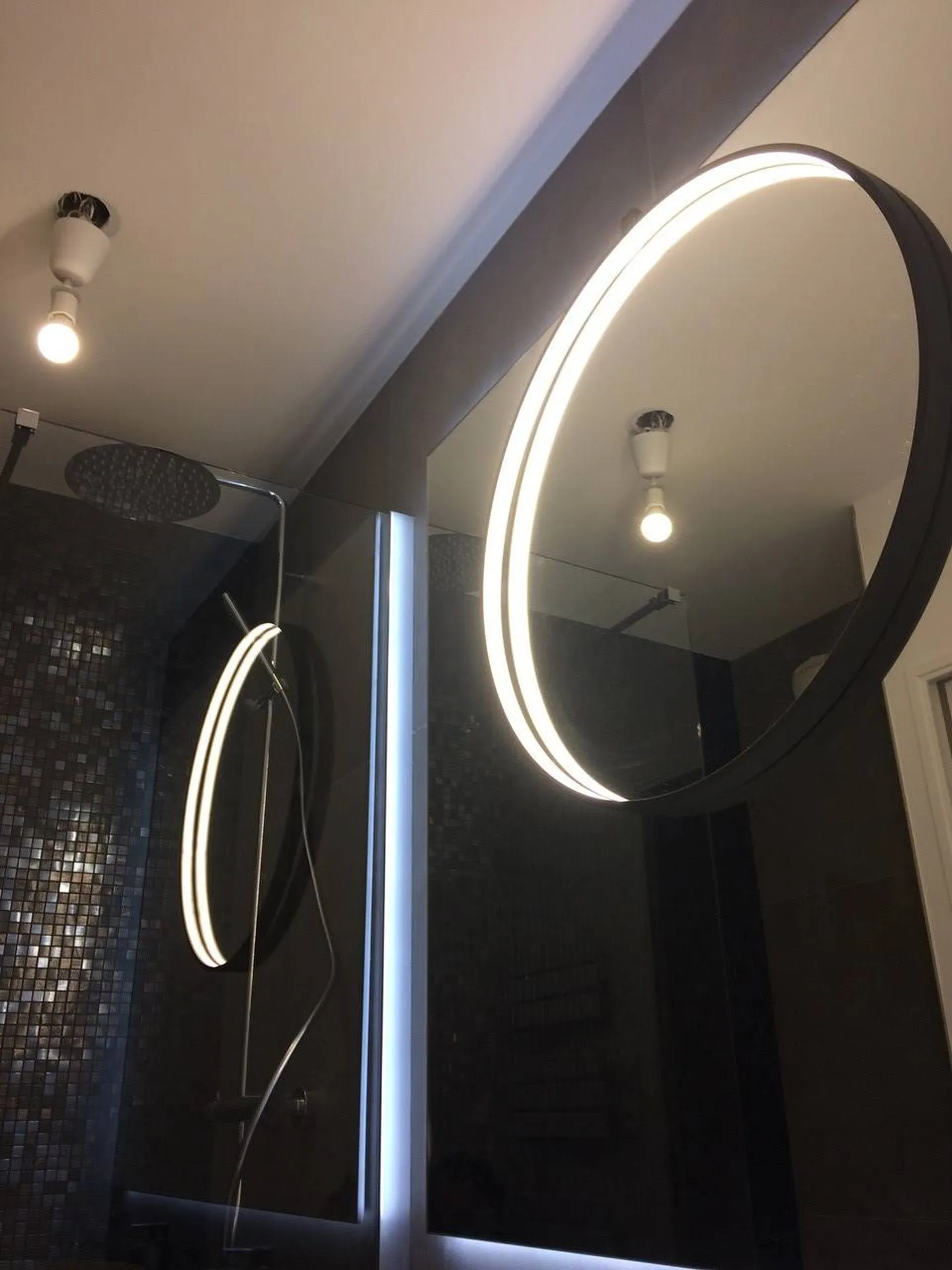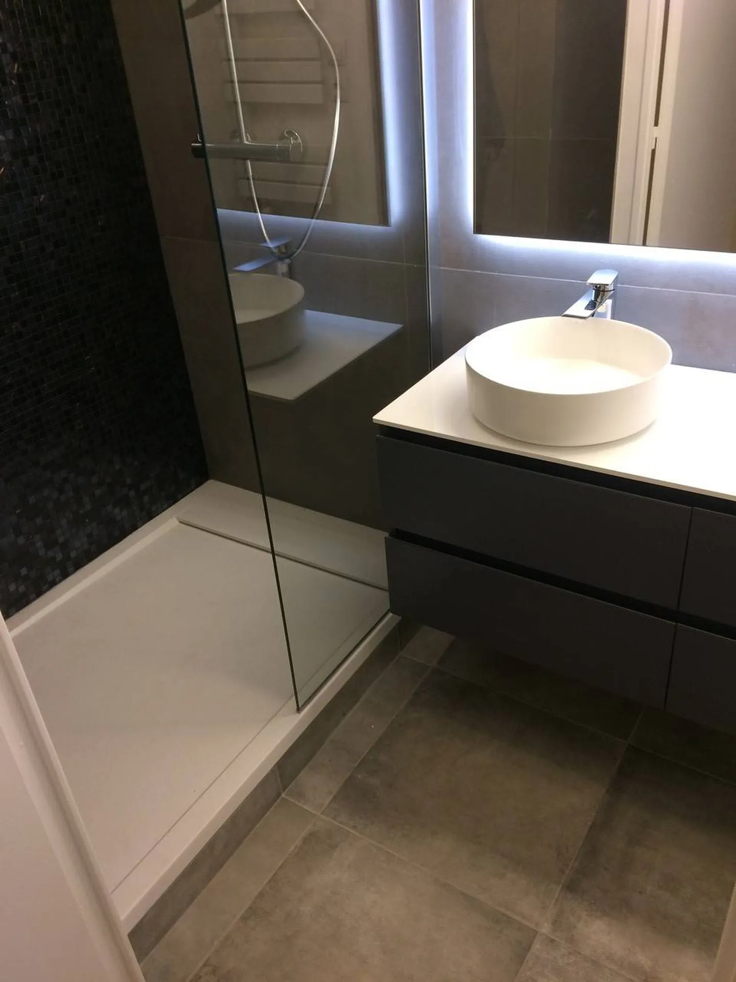 Vous trouverez ci-après des photos d'une de nos réalisations de salle de bain avec un mur en mosaïque Bisazza dans un appartement à Lyon.