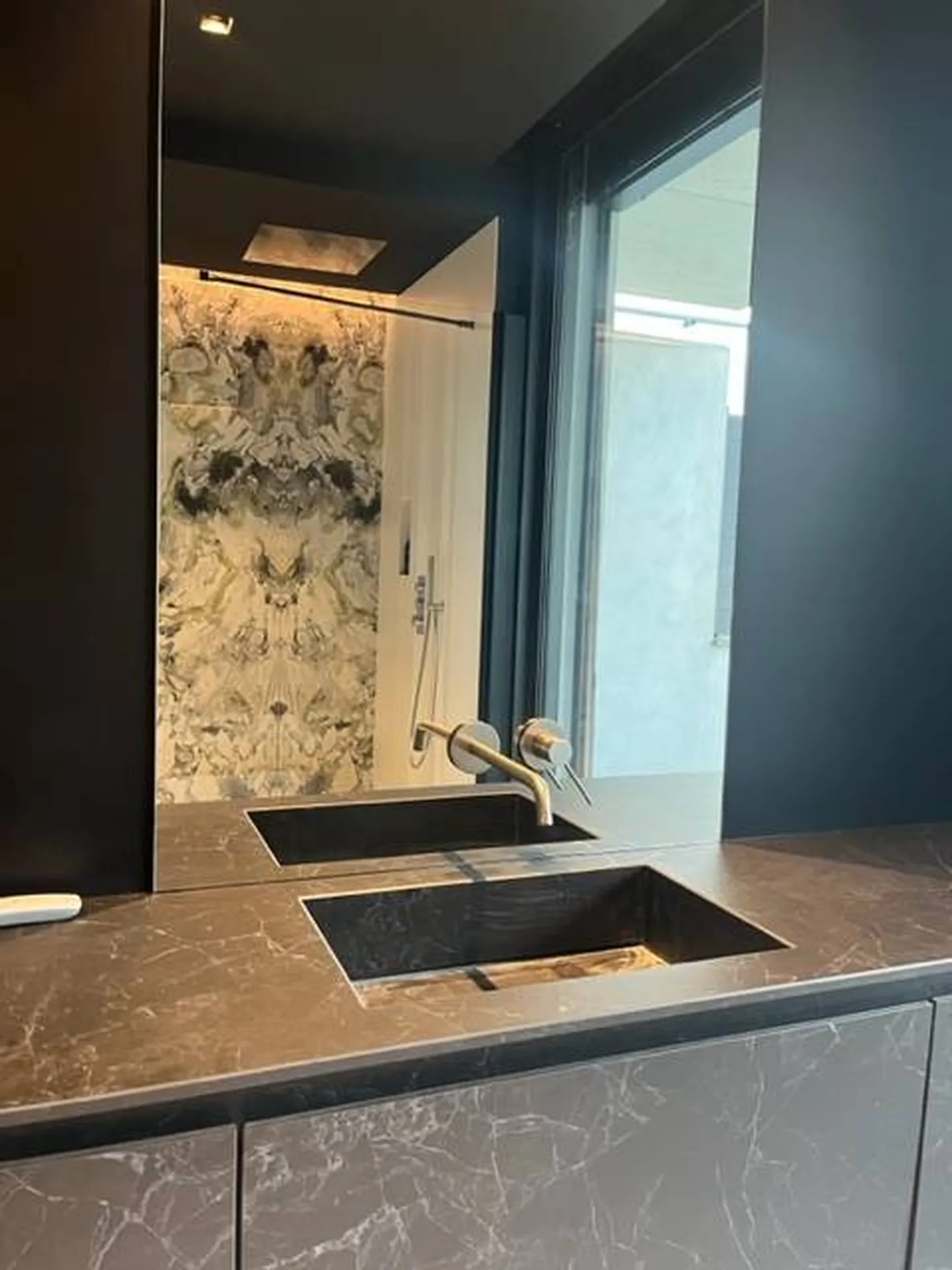 Le meuble ainsi que le plan vasque sont réalisés en marbre "nero marquinia" , les robinetteries inox intégrées GESSI dans les miroirs verticaux se joignent à ce mélange subtil sans jamais se mettre en concurrence tout comme la douche ainsi que la baignoire dans un blanc mat immaculé.