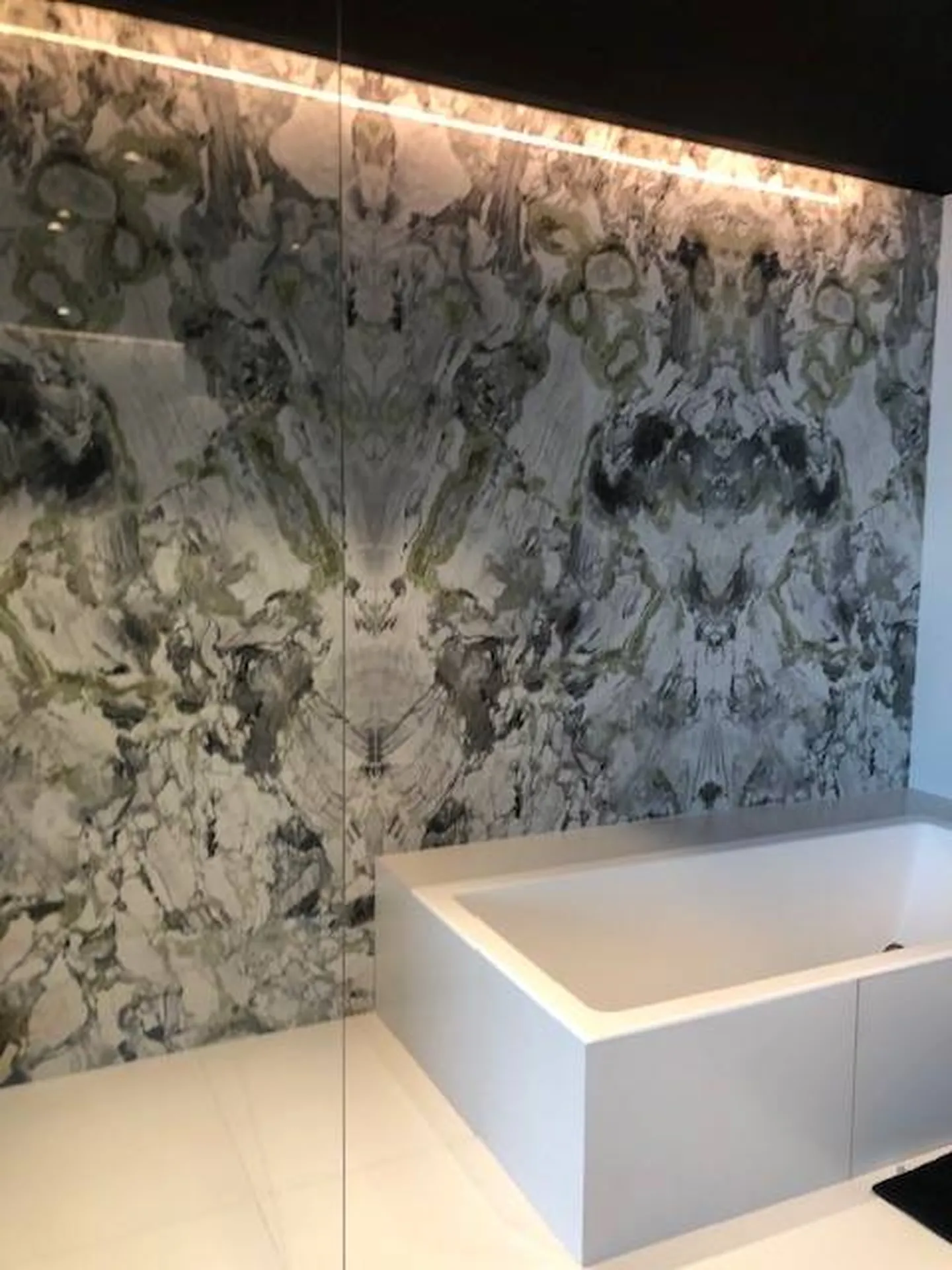 Nous avons donc opté pour un marbre "ice jade green" afin d'impacter visuellement cet espace et l'avons confronté à une céramique blanc mat se mettant à son service. les dimensions des matériaux vont du 120x120 au sol et 120x 280 au mur afin d'obtenir un suivi dans les décors et surtout ne pas les dénaturer par d'innombrables joints.